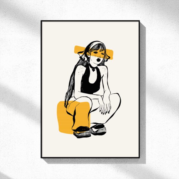 In de eenvoud van zwart-wit en de zachtheid van een crème achtergrond schuilt een meesterwerk dat de schoonheid van introspectie vangt. Deze tekening, een lijnenspel van precisie en subtiliteit, is een ode aan de kracht van het alledaagse – een stil moment dat zich ontvouwt in een sfeer van rust en zelfbewustzijn.